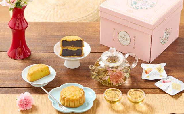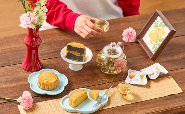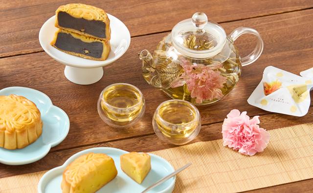 お湯で咲く工芸茶とティーポット、大月餅2種の豪華セット。