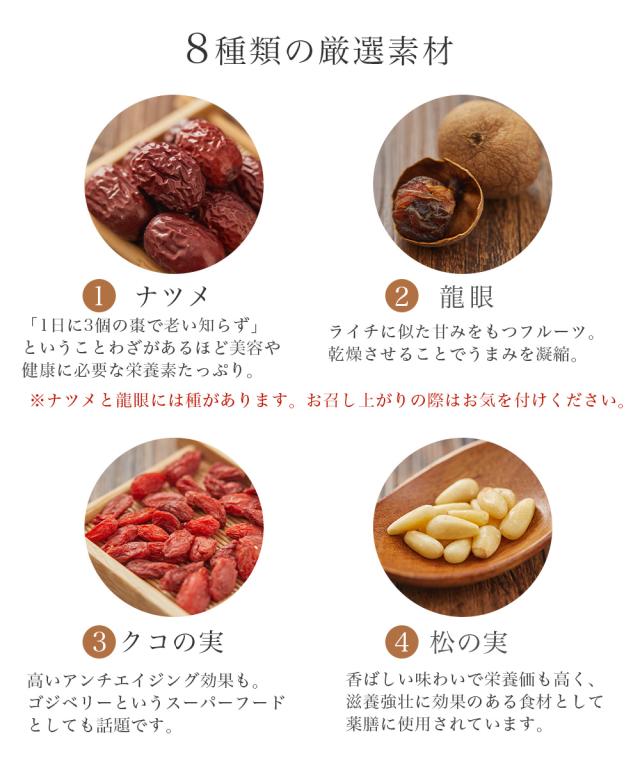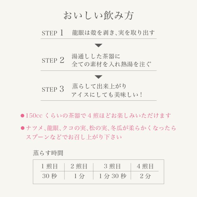 ●原材料:ジャスミン茶、クコの実、龍眼、ナツメ、冬瓜砂糖漬け、菊花、松の実、バラ茶