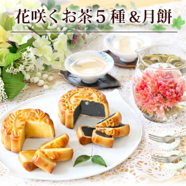 リムテー ギフト カーネーション 花さく 花茶 工芸茶5種 月餅 大月餅2種 詰め合わせ OHANAセット お菓子 スイーツ プレゼント フラワー 横浜中華街 ジャスミン茶 送料無料 誕生日