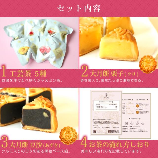 | 内 容 量 | ・工芸茶 5種類 ・大月餅 栗あん 1個 ・大月餅 小豆あん 1個 |
