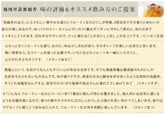 当店の鳳凰単叢蜜蘭香型はハクレンの清らかな香りが漂う飲みやすいタイプです。ハクレンのかすかな香りが鳳凰単叢の甘みを一層引き立て、これこそ烏龍茶の女王様にふさわしい味わいです。あなたも是非フルーティーな味わいを!