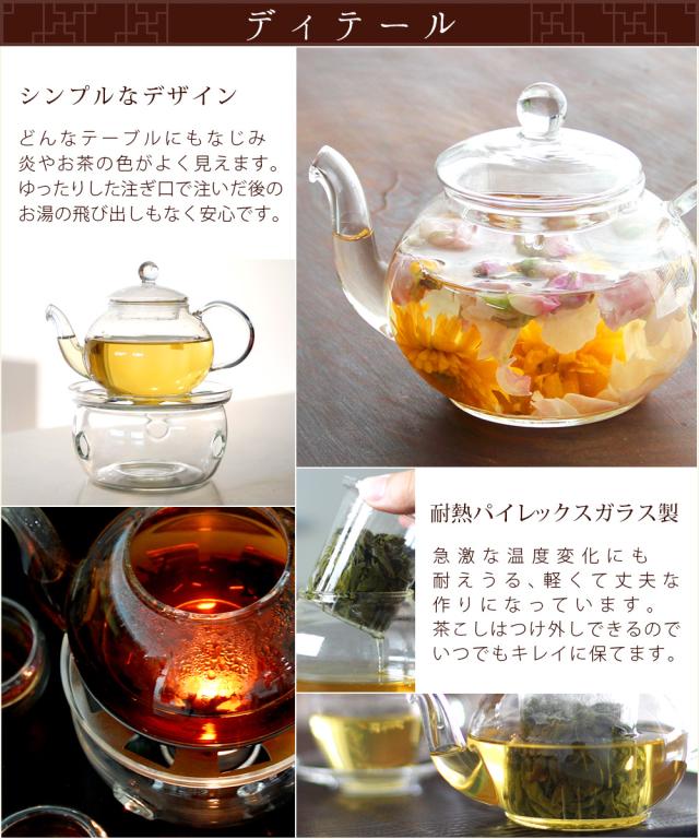 | 商品説明 | 1.ティーポットとウォーマーがセットになった、スグにお茶会ができる便利なセットです。 2.お茶の色やキャンドルの炎のゆらぎが良く見えるガラス製。癒しのひとときを。 3.キャンドルのやさしい炎で飲み頃の温度をキープします。 |
