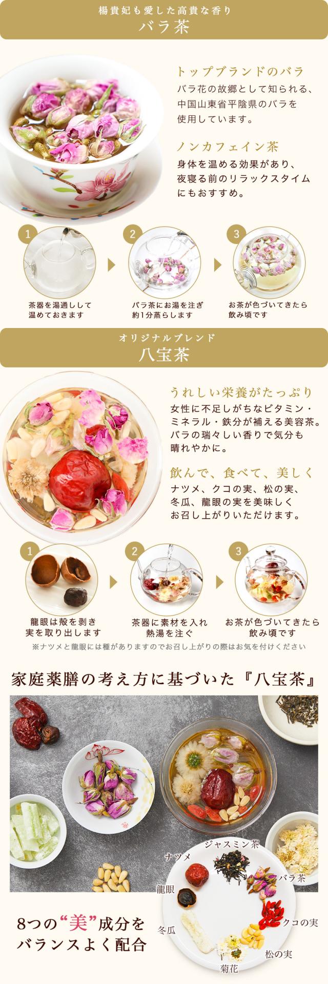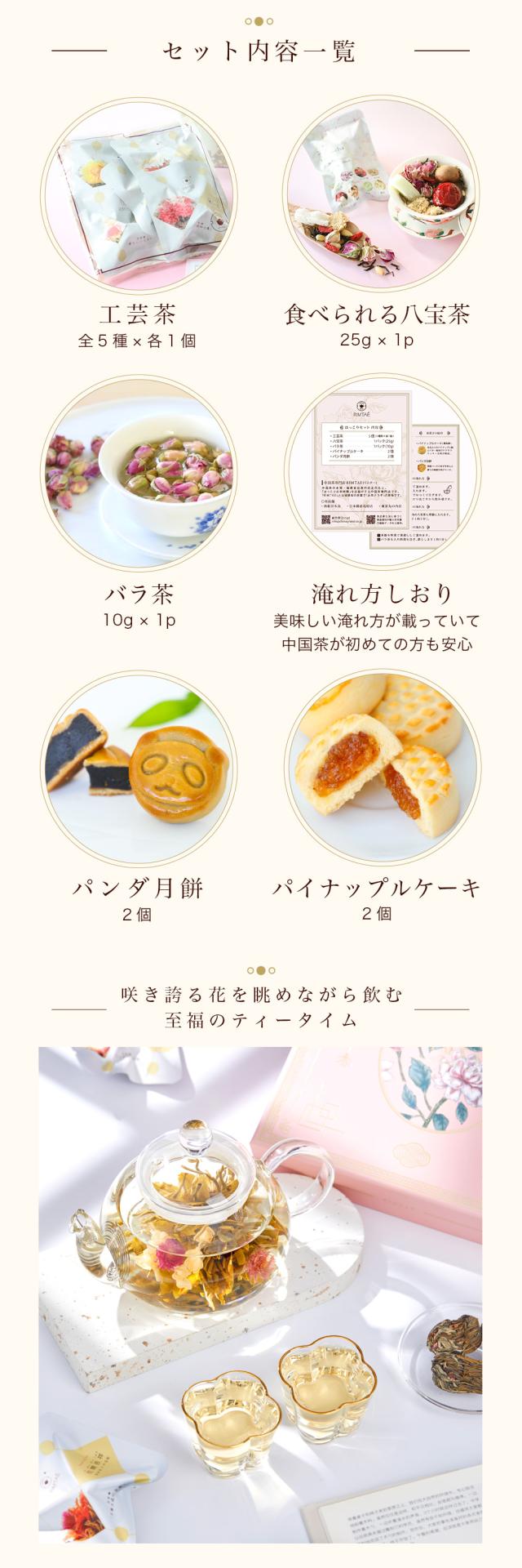 | 内 容 量 | ・萬紫千紅 1個 ・茉莉仙子 1個 ・百合花籠 1個 ・金花彩彩 1個 ・東方美人 1個 ・八宝茶 25g×1P ・バラ茶 10g×1P ・パイナップルケーキ 2個 ・パンダ月餅 2個 |