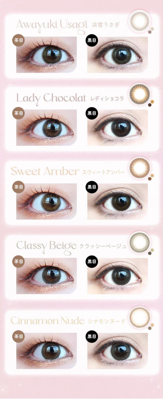 ■カラー:レディショコラ、スウィートアンバー、クラッシーベージュ、シナモンヌード、天使のなみだ、淡雪うさぎ、満月パンケーキ、星屑キャンディー、夢見パール、海月リング