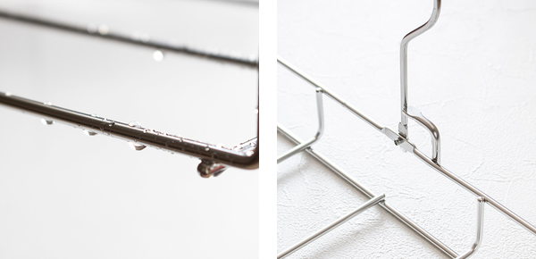 丈夫でサビに強いステンレス製です。プラスチック製ハンガーと違い、落としたりぶつけたりしても、欠けたり割れたりする心配がありません。