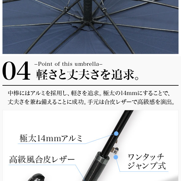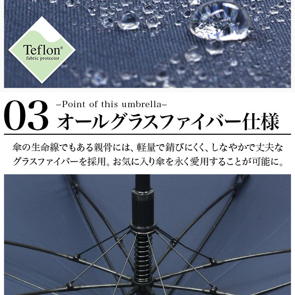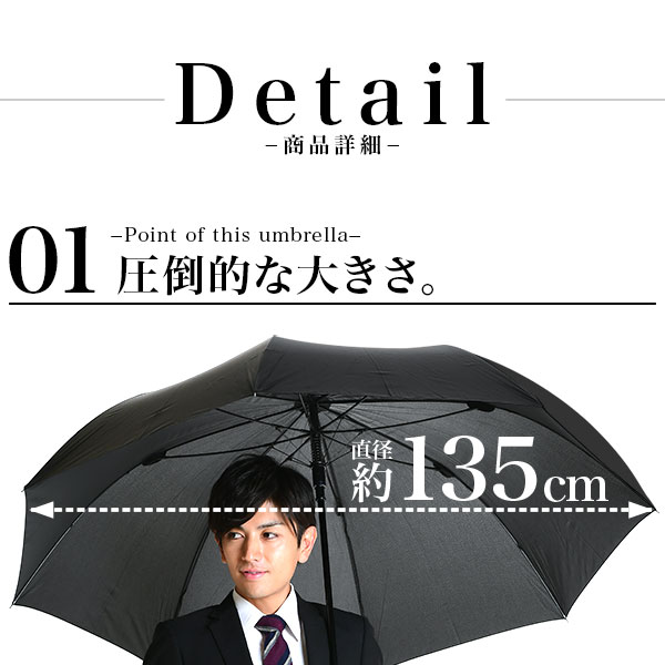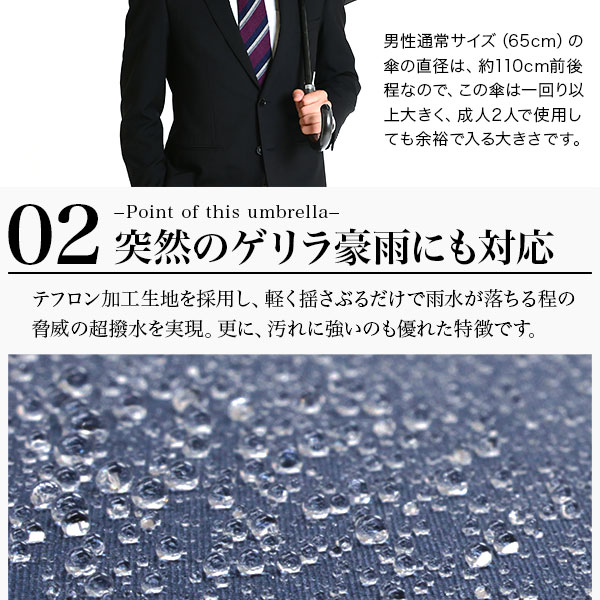 市販されている傘の中でも最大級の大きさ。通常の傘より一回り以上大きい直径135cmのサイズは成人男性2人が入っても余裕の大きさ。超撥水テフロン加工を採用しているので軽く揺さぶるだけで、雨水も綺麗さっぱり!