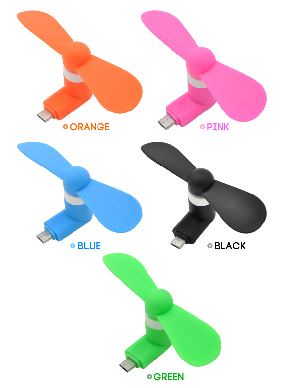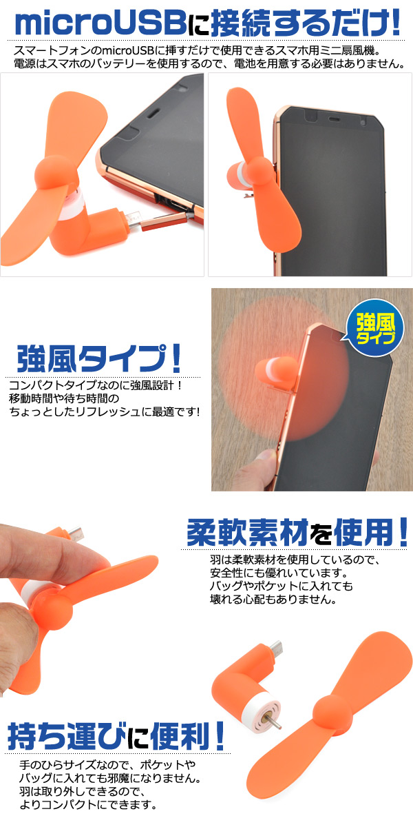 microUSBに接続するだけで使用できるスマートフォン用ミニ扇風機。電源はスマートフォンのバッテリーを使用するので、電池を用意する必要はありません。
