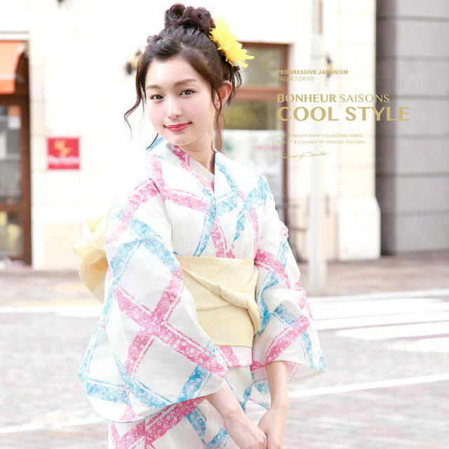 浴衣セット レディース レトロ 浴衣セット 大人 3点セット クリーム 黄色系 水色 ピンク 黄色 斜め格子 桜 ラメ 綿 兵児帯 女性 ボヌールセゾン