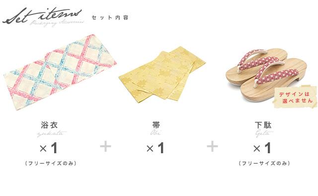 こちらの商品は、浴衣・帯・下駄の3点セットです。セット内容の一部変更や、それに伴う値引きは承っておりません。