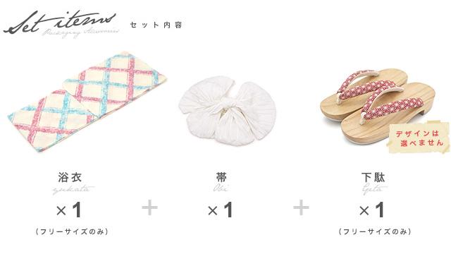 こちらの商品は、浴衣・帯・下駄の3点セットです。セット内容の一部変更や、それに伴う値引きは承っておりません。
