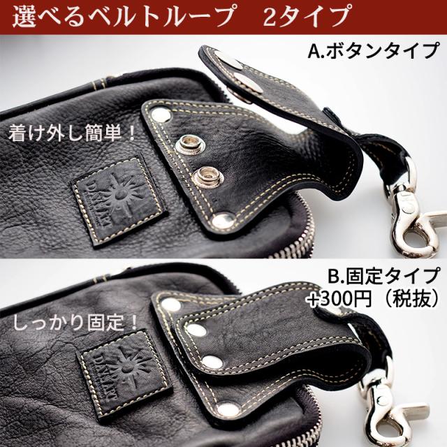 柔らかくキメの細かい上質なカーフスキンを使用して革職人がハンドメイドで製作しました。前面ポケットの縁取りにスタッズが打ち込まれており、デザインのアクセントになっています。長財布も収納可能なメインポケットに、フリップポケットにはスマホや煙草が収納でき、ファスナーポケットには6インチの大型スマホも収納可能です。男の小物はこれ一つで済ませられる普段使いにぴったりのベルトポーチです。ベルトループはボタン式になっているため簡単に付け外しができます。ストッパーがあるのでバイカーにもオススメです。
