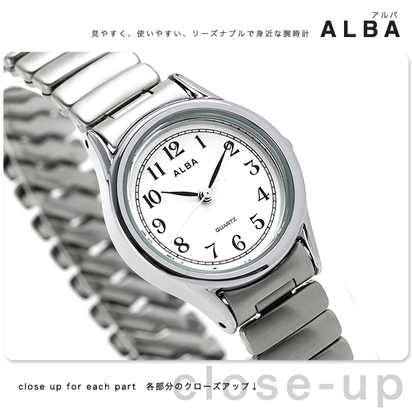 正規品 7年保証キャンペーン セイコー アルバ クオーツ ペアウォッチ レディース 腕時計 AQHK439 SEIKO ALBA アナログ ホワイト×シルバー アルバは、スタンダードなデザインからスポーティなデザインまで、幅広い年齢層に向けたクオーツウォッチを展開。見やすさと使いやすさに加え、それぞれのシーンにあった飽きのこないデザインが魅力です。 視認性の良いアラビア数字インデックスを採用。落ち着きのある定番カラーは様々なシーンで活躍します。バンドには伸縮性のある蛇腹ベルトを採用。メンズモデルとのペアウォッチとしてもオススメです。 旧品番:AADT065
