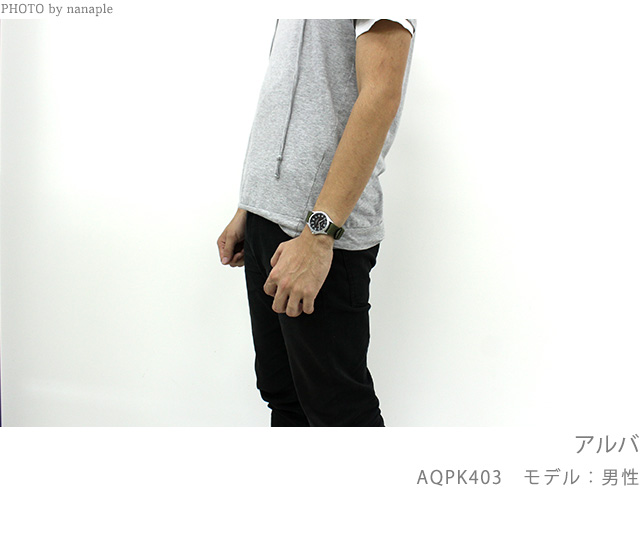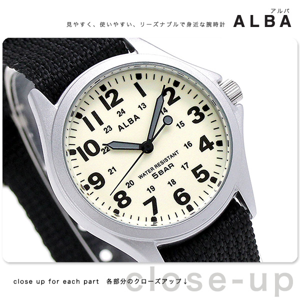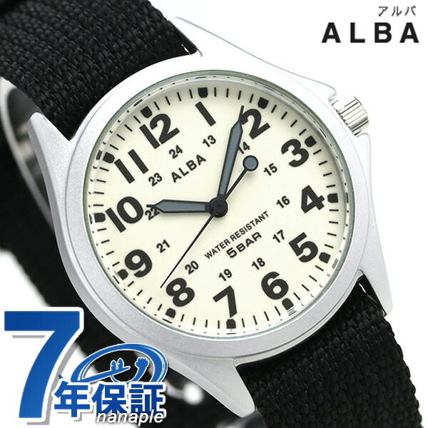 正規品 7年保証キャンペーン セイコー アルバ クオーツ メンズ 腕時計 AQPK401 SEIKO ALBA アナログ アイボリー×ブラック アルバは、スタンダードなデザインからスポーティなデザインまで、幅広い年齢層に向けたクオーツウォッチを展開。見やすさと使いやすさに加え、それぞれのシーンにあった飽きのこないデザインが魅力です。 大き目のアラビア数字インデックスや目盛表記など、実用性のあるデザインが魅力的。カジュアルなナイロンベルトを採用しています。 旧品番:APBS111