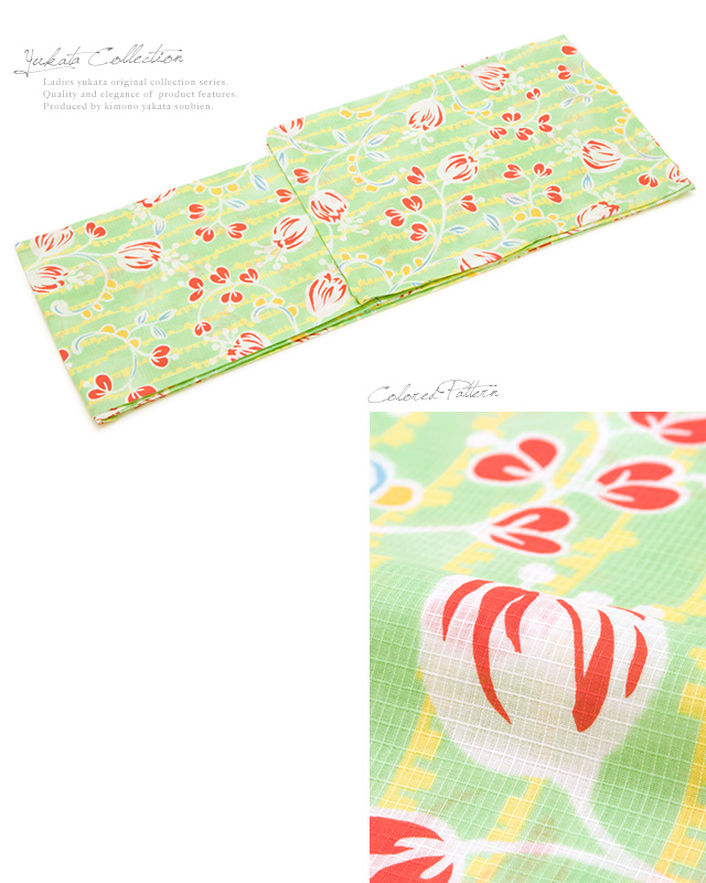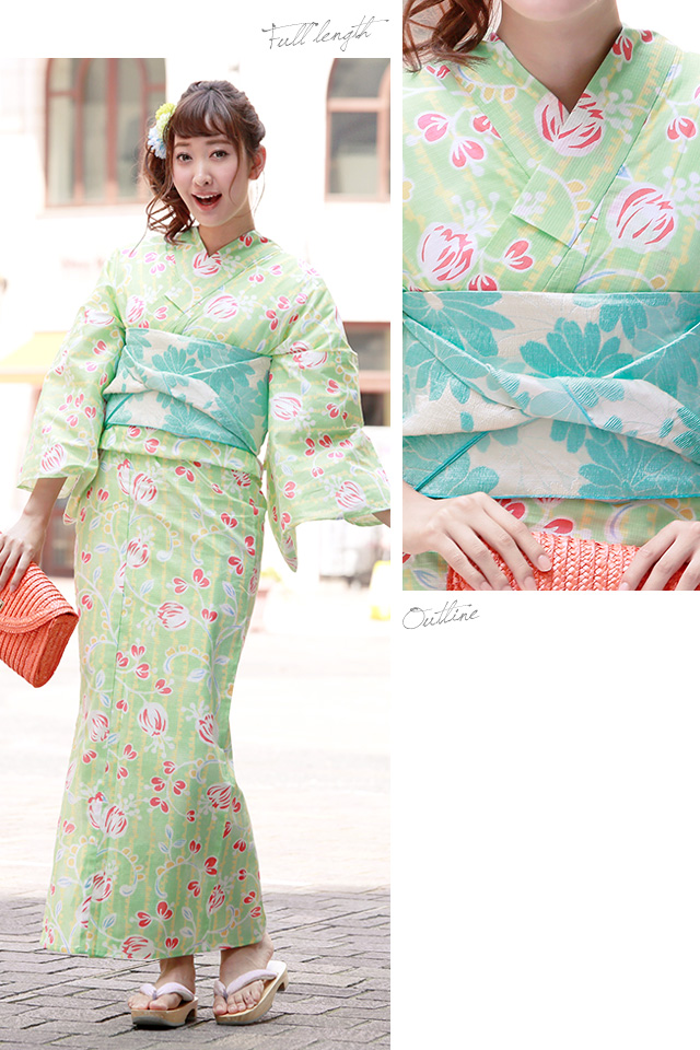 浴衣セット レディース レトロ 浴衣セット 大人 3点セット 緑系 グリーン 水色 花 変わり縞 綿 紅梅織 兵児帯 女性 キスミス