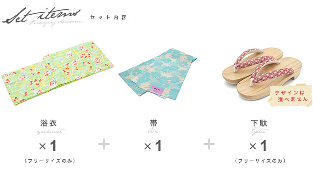 こちらの商品は、浴衣・帯・下駄の3点セットです。セット内容の一部変更や、それに伴う値引きは承っておりません。