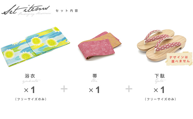 こちらの商品は、浴衣・帯・下駄の3点セットです。セット内容の一部変更や、それに伴う値引きは承っておりません。