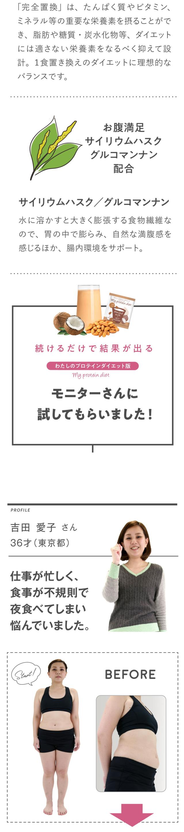 - 置き換えダイエットは初めてです。思ったより空腹を感じません。甘味があるミルク系飲み物が苦手でないので、少しクセを感じるものもありますが概ね美味しく飲めています。置き換えの効果は今からの経過次第ですね。