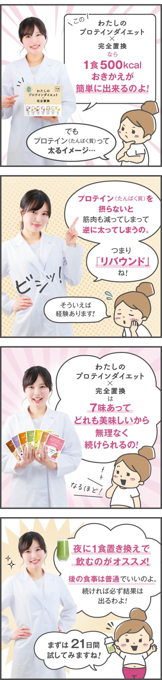 ・「わたしのプロテインダイエット×完全置換」1袋を加え、すばやくよくかきまぜてお召し上がりください。