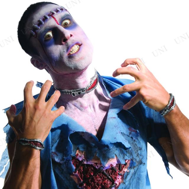 | 商品説明 | 皮膚がジッパーで開いているように見える不気味なアクセサリです。首に1つ、両手首に1つずつ装着できます |