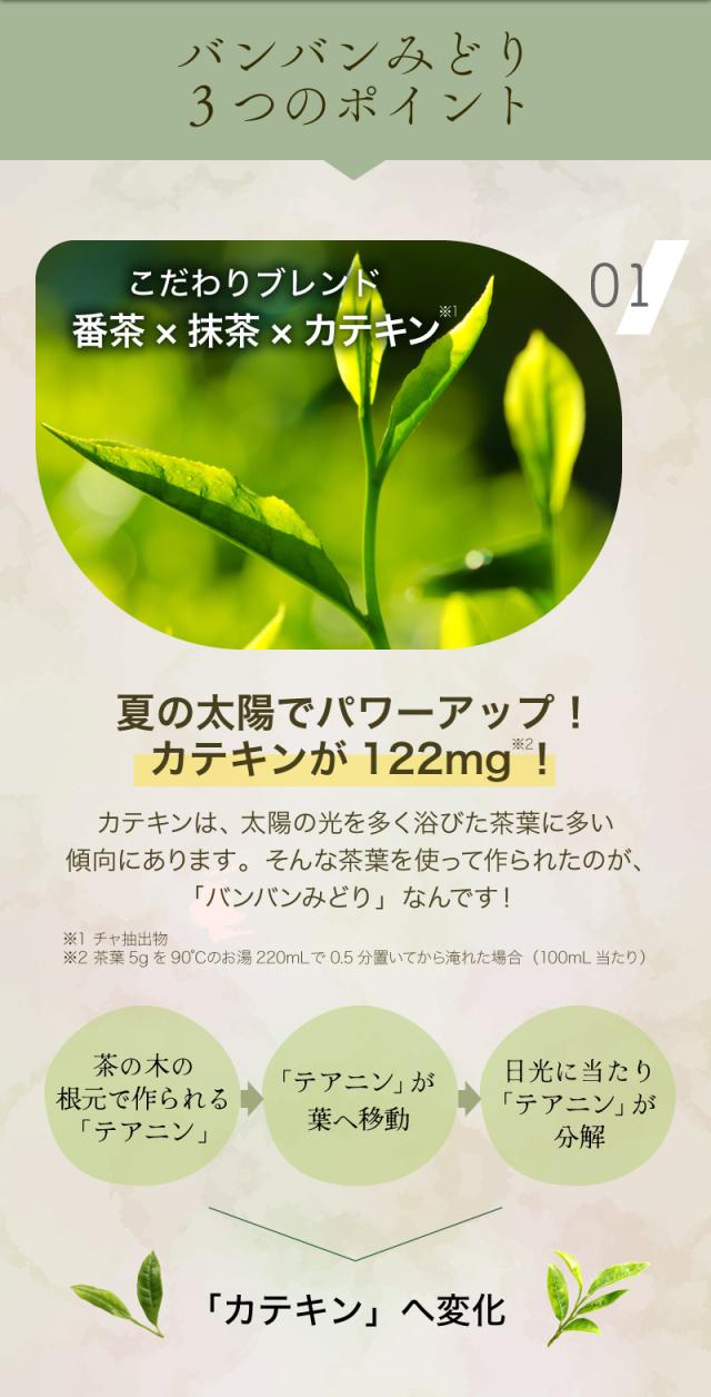 カテキンは、太陽の光を多く浴びた茶葉に多い傾向があります。バンバンみどりはそんな茶葉を使って作られているんです♪