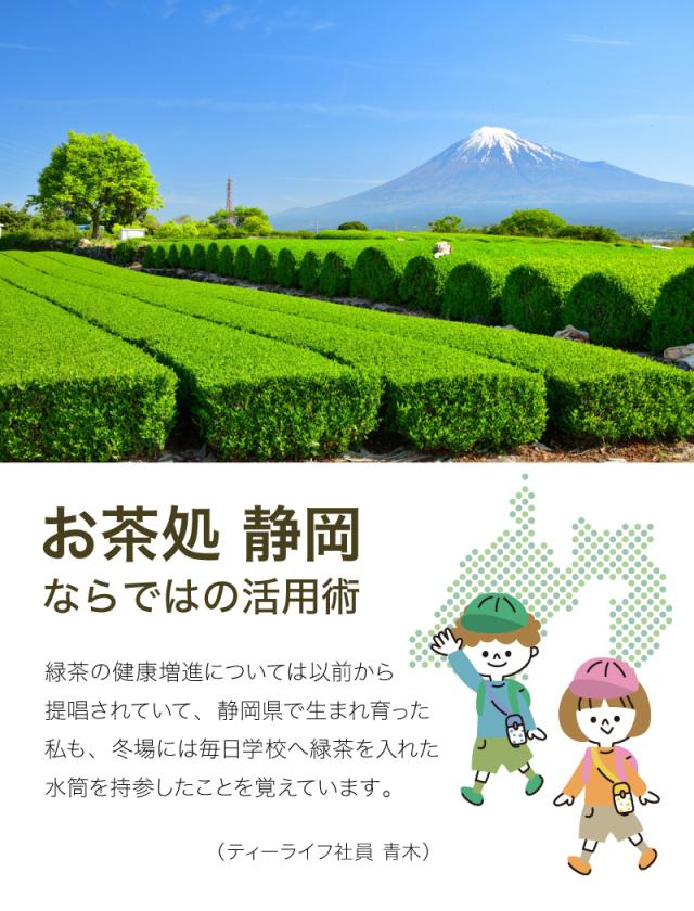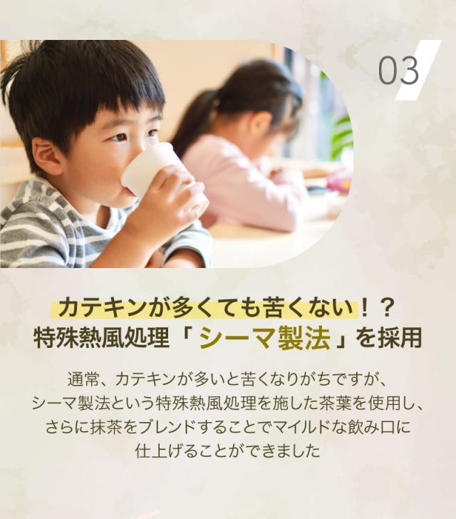 ティーライフでは、「シーマ製法」という特別な処理を施した茶葉を使用し、さらに抹茶をブレンドしているので、カテキンたっぷりでも苦くない、マイルドな味わいに仕上がっています。