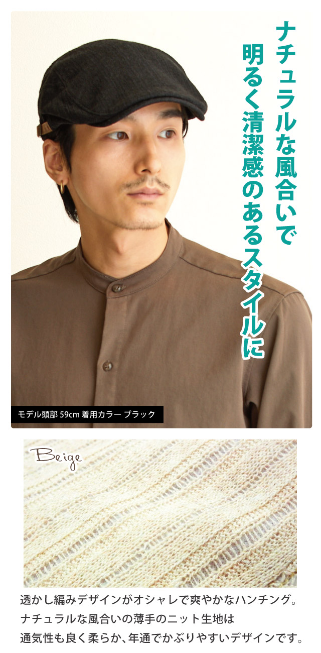 薄手のニット生地&メッシュ生地の裏地で爽やかにかぶれるハンチングです。