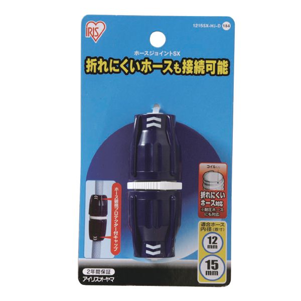ホースジョイントSX 1215SX-HJ-D ホワイト/マリンブルーホースとホースの接続可能。濡れ手でも回しやすく、ホースプロテクター(破裂防止対応)一体型構造のコンパクトデザイン!適合ホース内径Φ12〜15mm、外径20mmまでの折れにくいホース対応の新規格です。●商品サイズ(cm):直径約3.3×高さ約9.2●主要材質:AES樹脂、ABS樹脂、ポリプロピレン、ポリエチレン、NBR●適合サイズ:内径Φ12〜15mm、外径20mmまでの折れにくいホース対応(検索用:ガーデニング用品・散水用品・散水パーツ・ホースリール・連結部品・修理部品・ジョイント・コネクター・接続部品・交換部品・アイリスオーヤマ)