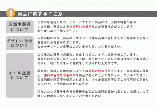 | ■備考 | ※天然木のため、節や、乾燥による割れや、反りが発生する場合があります。強度に問題はありませんので、安心してご使用ください。 ※入荷時期により、商品のデザイン・仕様が品質に差し支えない程度に予告なく変更される場合がございます。大きなデザインの変更はございませんが、ご注意ください。 |