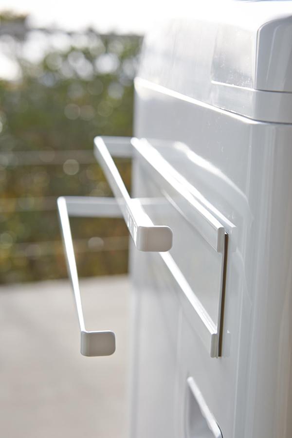●干す場所に困るバスタオルやバスマットなどを、洗濯機横に強力磁石でスリムに収納