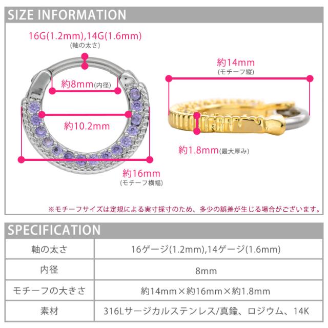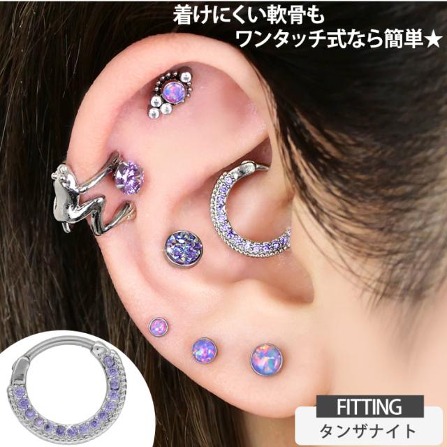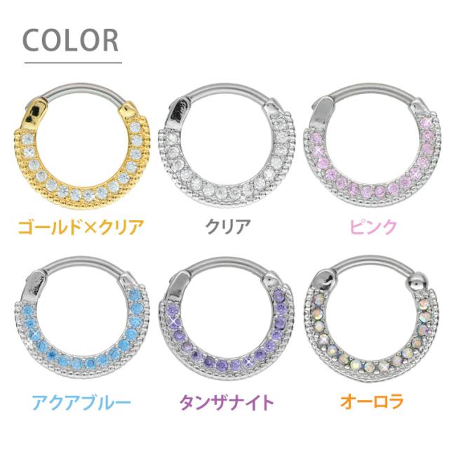 ラウンド状に並んだジュエルがキラキラと輝く、とっても美しいリングです。取り外ししやすいワンタッチ仕様で、キャッチを失くす心配もありません。太さのサイズは使いやすい16Gと14Gなります。ホールに直接触れる軸部分には、金属アレルギーでも安心の医療用素材"316Lサージカルステンレス"を採用。モチーフ部分は真鍮製です。カラ—はゴールド、クリア、ピンク、ライトブルー、タンザナイト、オーロラからお選びいただけます。