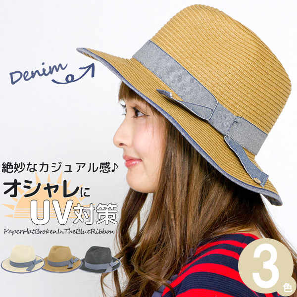麦わら帽子 レディース ペーパーハット 春夏 つば広 HAT デニム ストローハット / ブルーリボン中折れペーパーハット