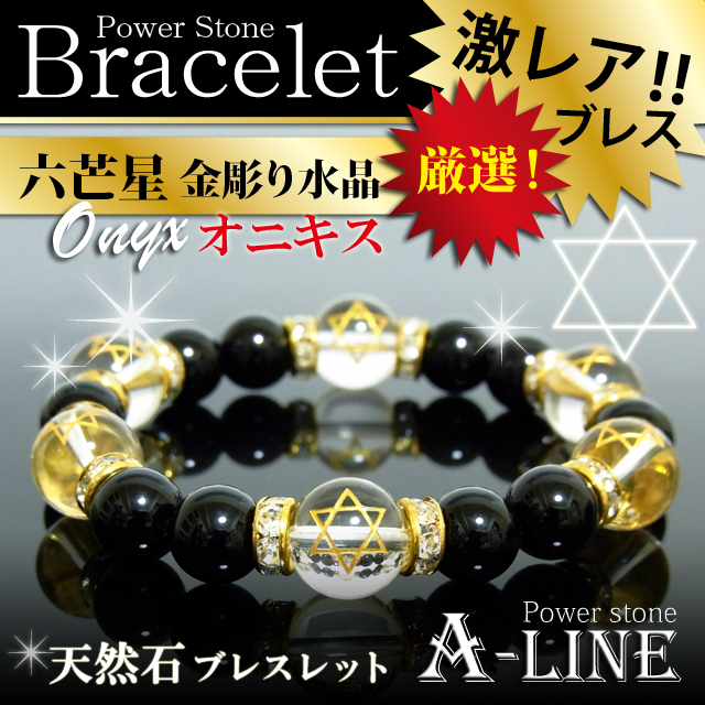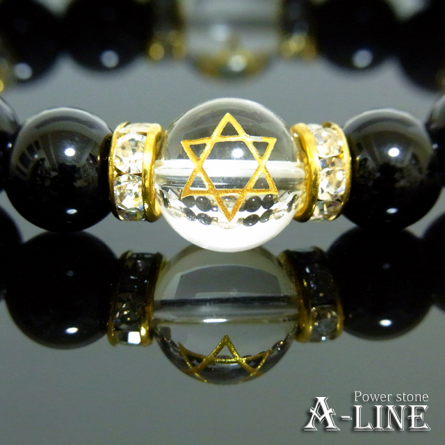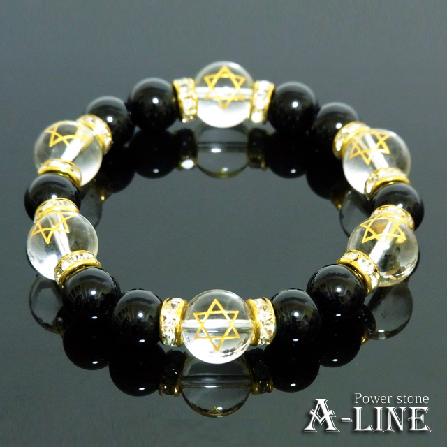 【W六芒星金運】≪六芒星の位置に金彫り六芒星水晶12mmを配置!オニキス10mm≫パワーストーンブレスレット♪PW-3007
