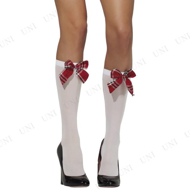 コスプレ 仮装 オペークニーソックス ホワイト タータンチェックリボン付 Smiffy's プチ仮装 コスプレ小物 小道具 靴下 ストッキング タイツ フリーサイズ 女性 リボン付き