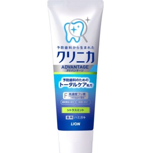 (▼3980円以上送料無料(但し沖縄県・.離島は送料負担がございます。)弊社では、当日発送は対応しておりません。)ライオン クリニカアドバンテージハミガキ シトラスミント タテ型 130gは「予防歯科」の3つのポイント(フッ素・殺菌・歯垢除去)を1本でトータルに実践できる薬用ハミガキです。「高密着フッ素処方」で、エナメル質の修復を促進しムシ歯の発生と進行を防ぐ。歯垢を分解・除去する「酵素(デキストラナーゼ)」、さらに歯垢を落としやすくする「TDS(テトラデセンスルホン酸Na)」配合。「LSS(ラウロイルサルコシンNa)」が原因菌を殺菌しムシ歯・口臭を予防。「シトラスミント」の香味。「医薬部外品」 【4903301241447】○ポイント使用のご注意:ポイントの変更はシステム上出来ません。欠品などで変更が生じた場合は、現金にて返金、又はキャンセル後、再注文をお願いする場合がございますのでご了承下さい。【4903301241447】