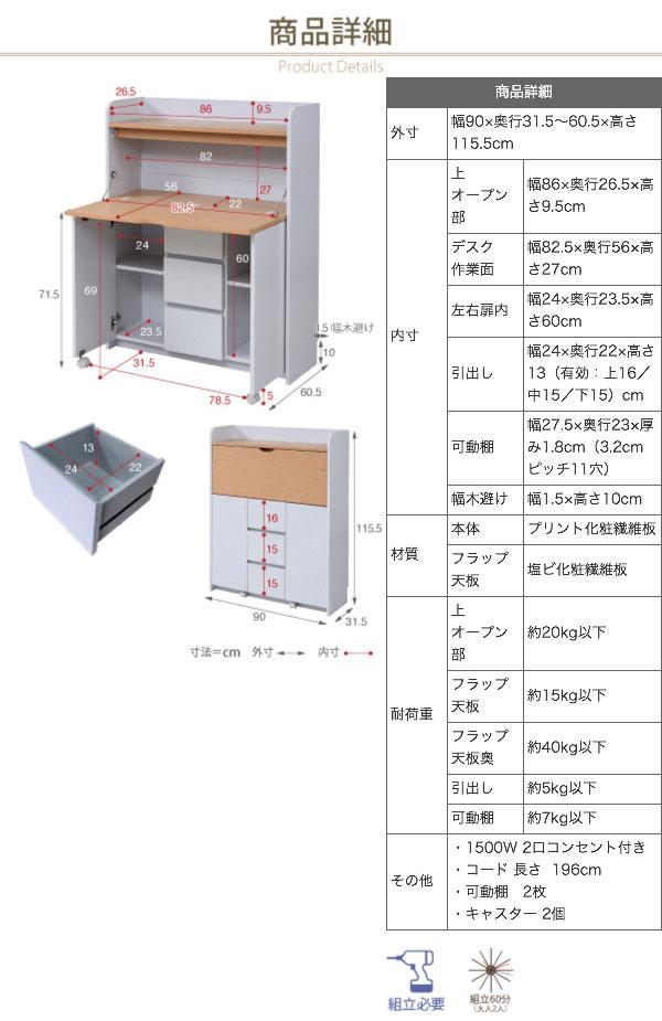 外寸 幅90×奥行31.5〜60.5×高さ115.5cm
