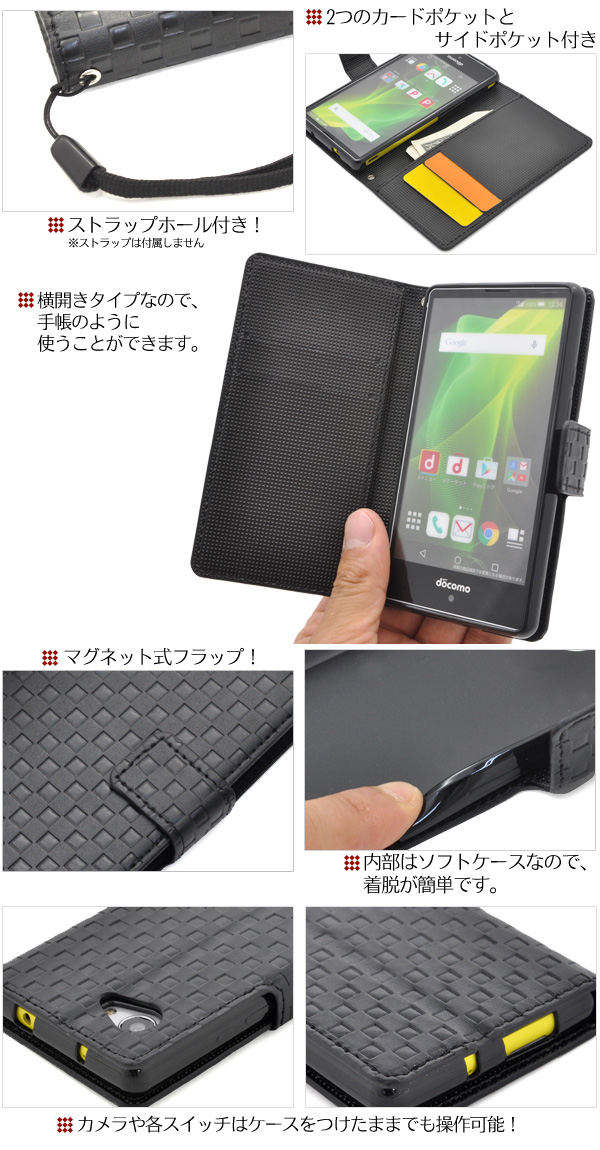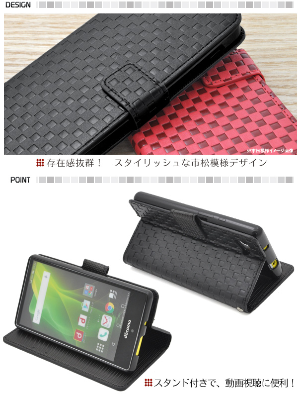 | 市松模様レザーデザインのスタンドケースポーチ。 衝撃やキズなどからスマホを守ります。 また、内部はソフトケースなので着脱が簡単です。 背面を折り返すとスタンドとして使用できるので、動画視聴に便利です。 落下防止に便利なストラップホール付きです。 横開きタイプなので、手帳のように使うことができます。 また、内側に2つのカードポケットとサイドポケットが付いています。 ※AQUOS Compact SH-02Hは付属しません。 ※ライセンス商品ではありません ※カードは付属しません。 | ||||||||||