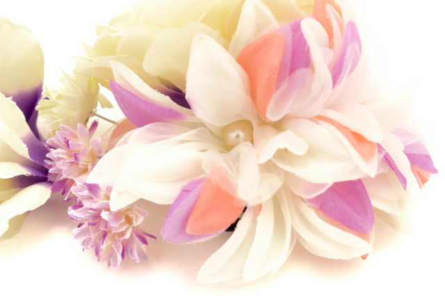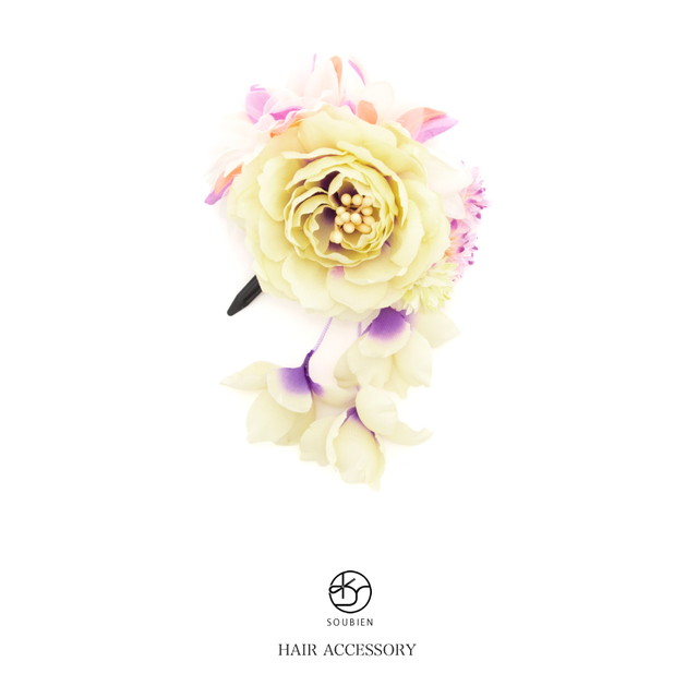 牡丹とパールの花弁を持つ花、小さいダリアに似た可憐な花々がモチーフの髪飾りです。