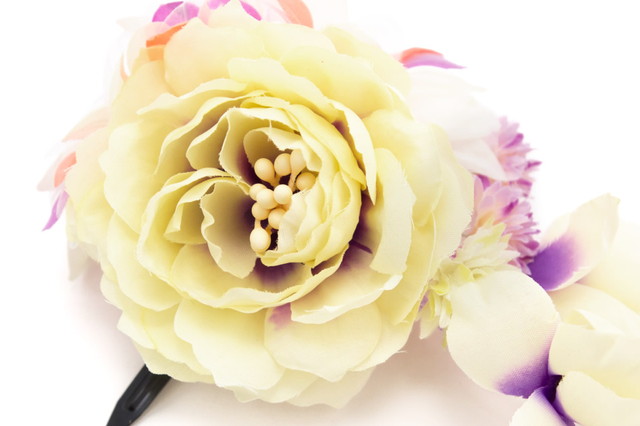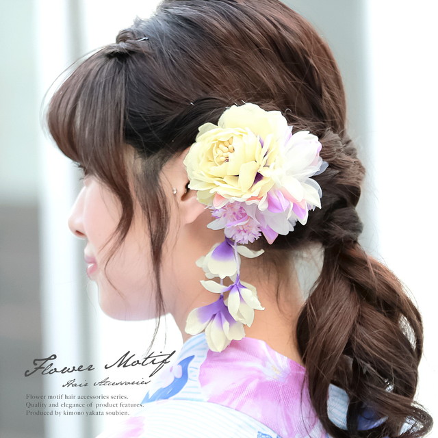 髪飾り 薄黄色 イエロー 白 紫 牡丹 花 フラワー ブラ飾り くちばしクリップ パール 浴衣向け 夏 髪かざり ヘアアクセサリー
