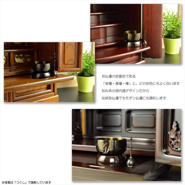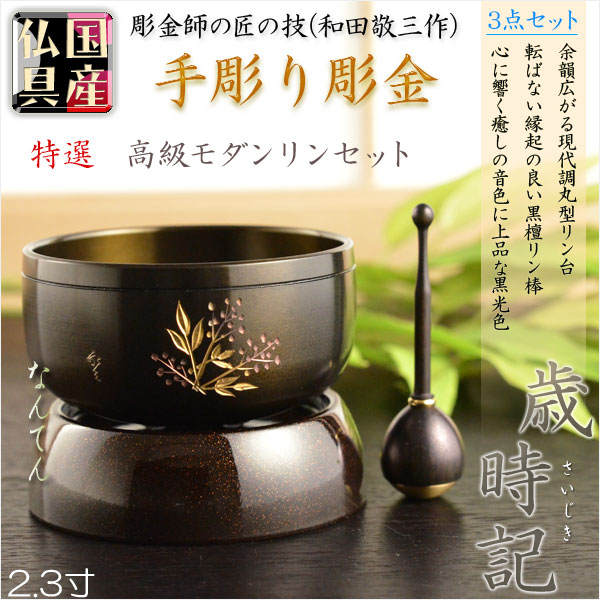 国産仏具・特選おりん【モダンリンセット:手彫り彫金 歳時記(さいじき)2.3寸 なんてん】送料無料