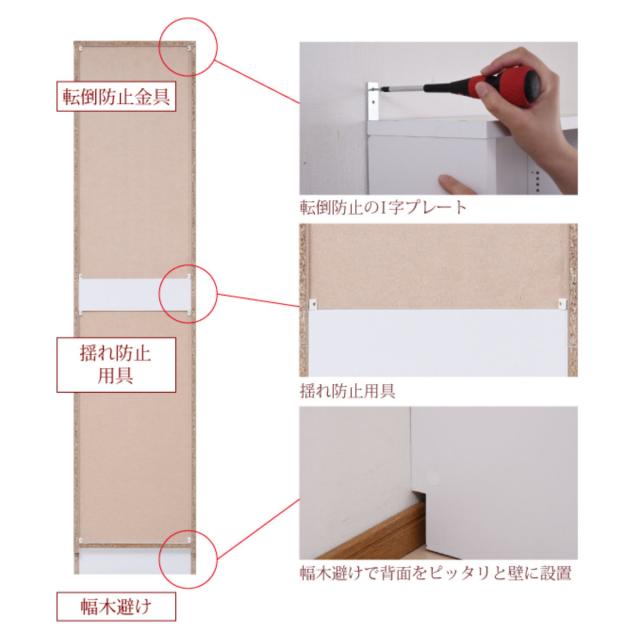 転倒防止金具、背面には揺れ帽子用具を取り付けられ、幅木避け加工で背面を壁にピッタリと付けて設置ができます。また、背板には安定さを維持する裏側固定が施されているのでたくさん収納しても安心です。