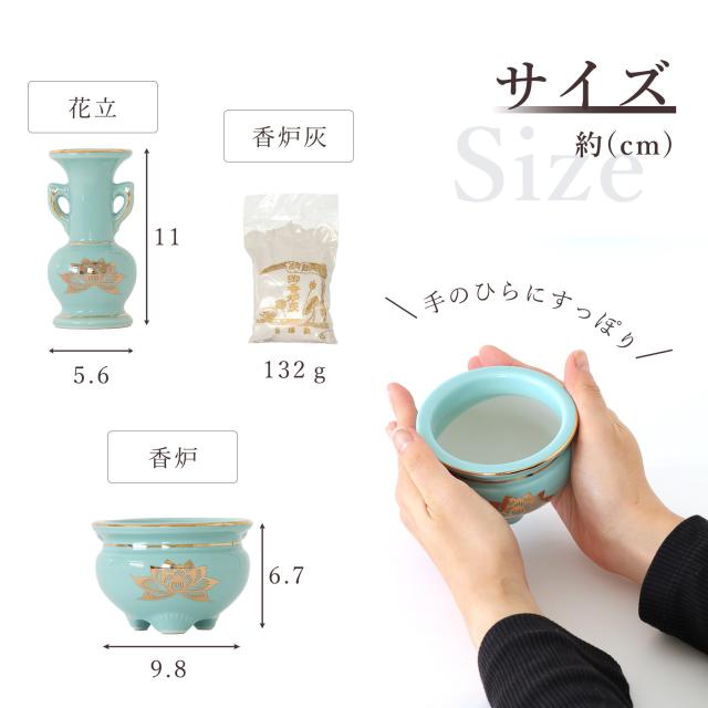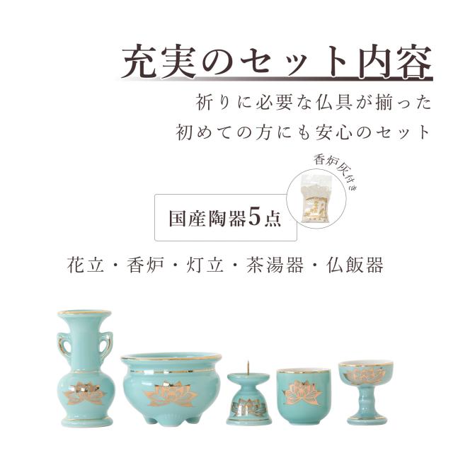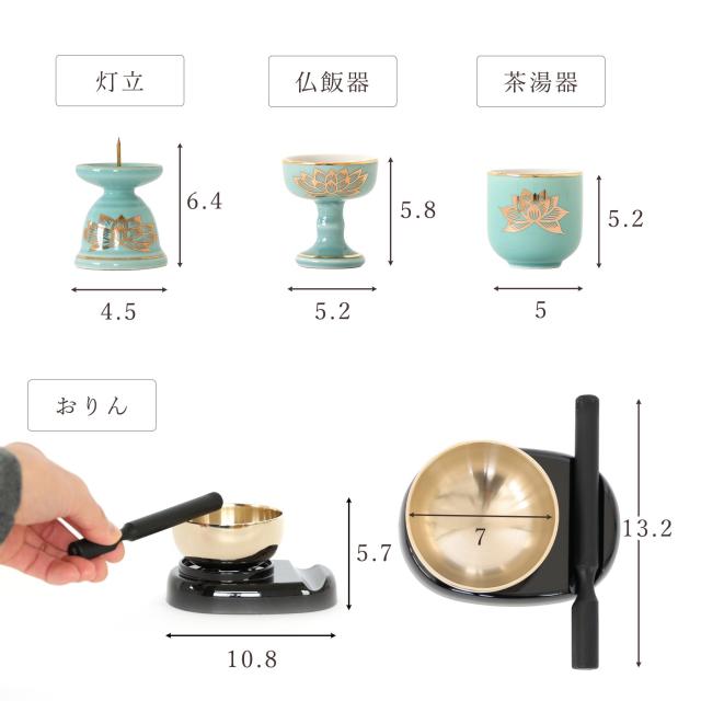 仏具 セット ミニ おりん 3点+陶器5点(青磁 金蓮 青地 キンハス ブルー)+香炉灰 仏具セット おしゃれ モダン 国産 日本製 仏壇セット モダン仏具 モダン仏壇 お盆 お彼岸 お墓参り お供え 供養 法事 法要