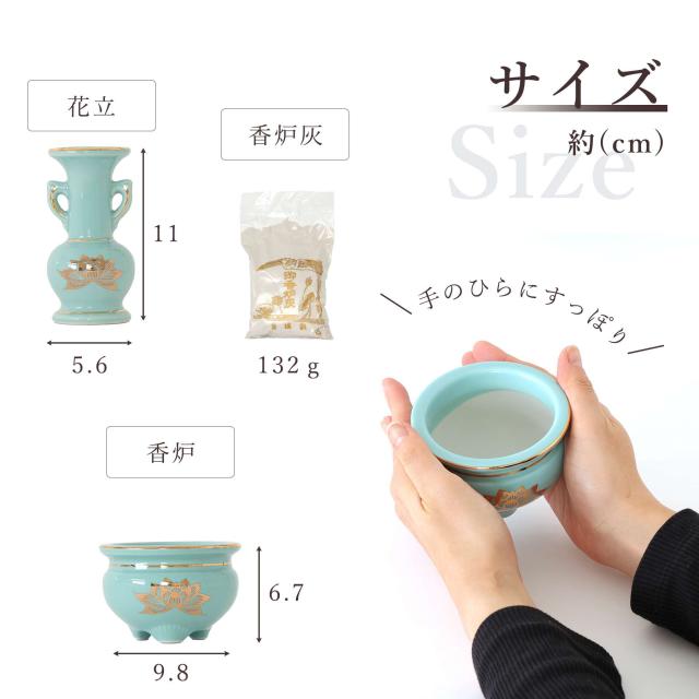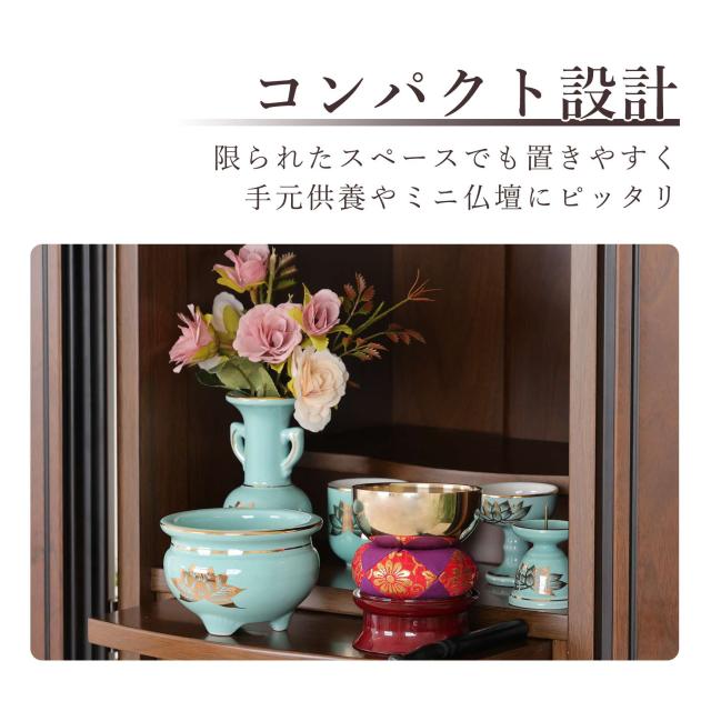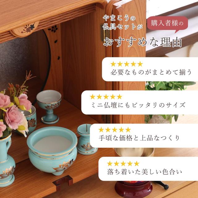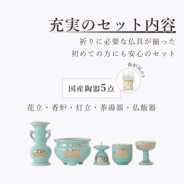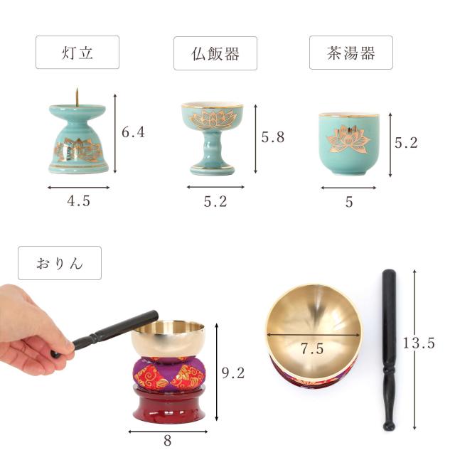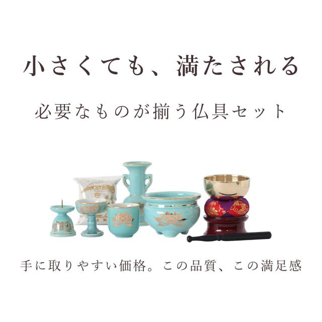 仏具 セット ミニ おりん 4点 + 陶器5点 (青磁 金蓮 青地 キンハス ブルー) + 香炉灰 仏具セット おしゃれ モダン 国産 日本製 仏壇セット モダン仏具 モダン仏壇 お盆 お彼岸 お墓参り お供え 供養 法事 法要