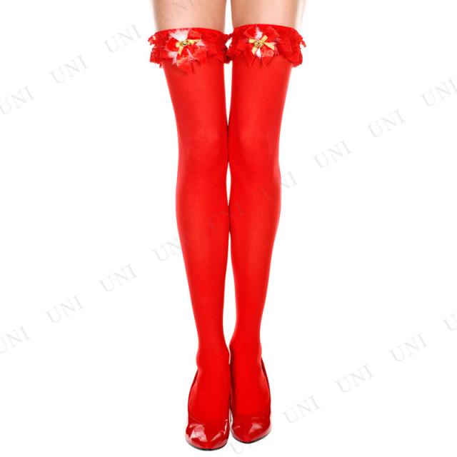 レースフリルトップ レッドサイハイストッキング Music Legs クリスマス仮装用小物 靴下 タイツ フリーサイズ リボン付き