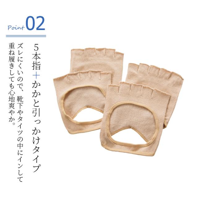5本指、かかと引っ掛けタイプで、ズレにくくムレ対策ができます。靴下やタイツの中に履いたりと重ね履き心地爽やか。シルク混で、吸湿性・放湿性は良く、足指の汗や汗による臭い対策に!