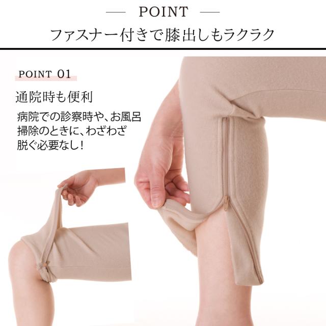 病院での診察時や、お風呂掃除のときに、わざわざ脱ぐ必要なし!膝までついてるファスナーをさっと上げるだけで、らくらくまくれます。