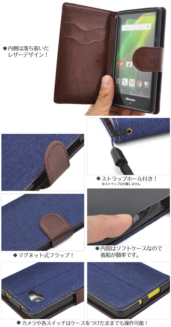 | デニムデザインのスタンドケースポーチ。 衝撃やキズなどからスマホを守ります。 内部ケースはソフトケースなので、着脱が簡単です。 背面を折り返すとスタンドとして使用できるので、動画視聴に便利です。 便利なストラップホール付きです。 横開きタイプなので、手帳のように使うことができます。 また、内側に2つのカードポケット付きです。 ※SH-02Hは付属しません。 ※ライセンス商品ではありません。 | ||||||||||