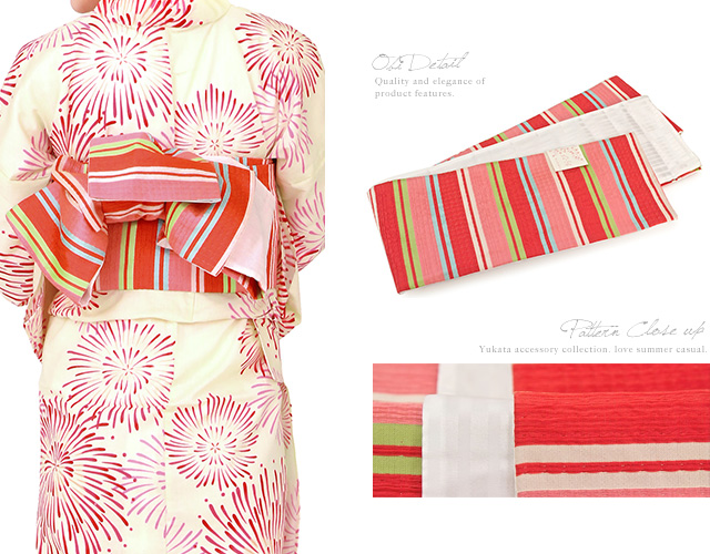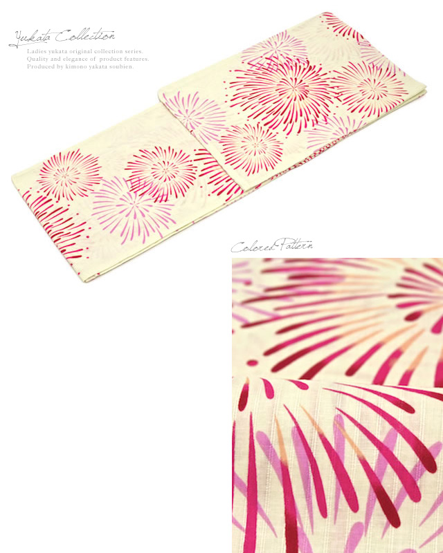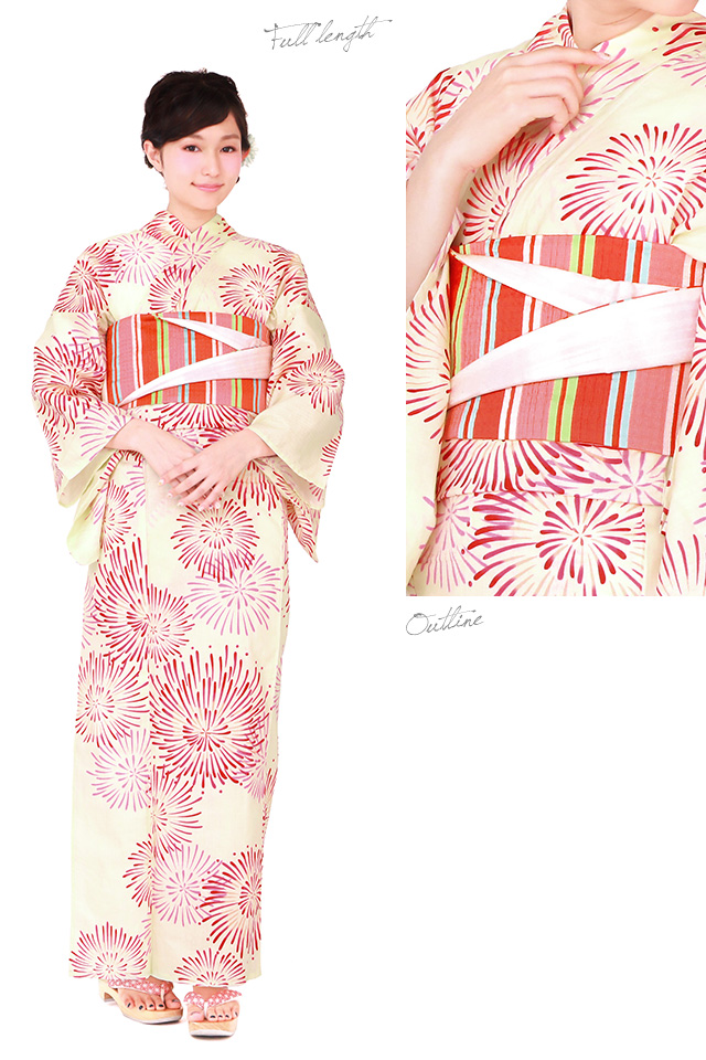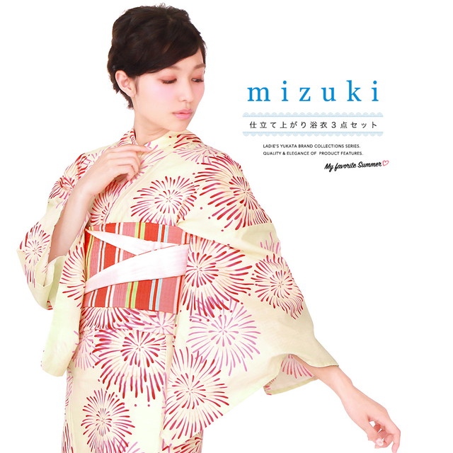 浴衣セット レディース レトロ 浴衣セット 大人 3点セット クリーム 黄色系 赤 花火 綿麻 兵児帯 女性 mizuki 美月
