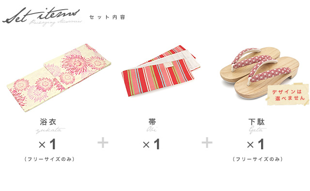 こちらの商品は、浴衣・帯・下駄の3点セットです。セット内容の一部変更や、それに伴う値引きは承っておりません。