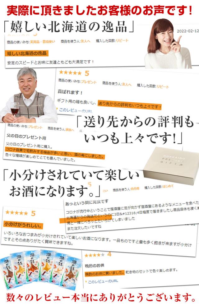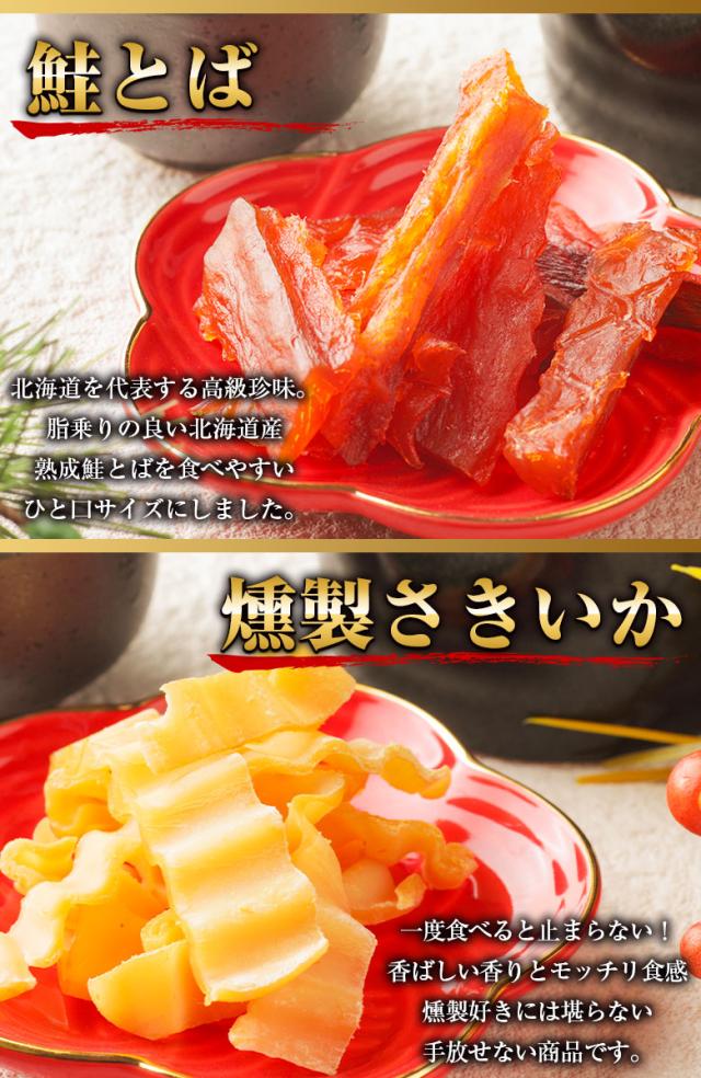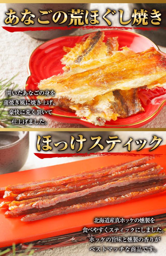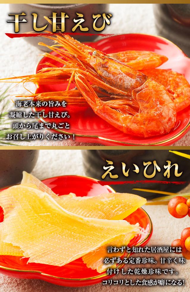 【内容量】 珍味6パック(干し甘えび・鮭とば・ほたて貝ひも・ほっけスティック・あなごの荒ほぐし・おつまみ昆布)