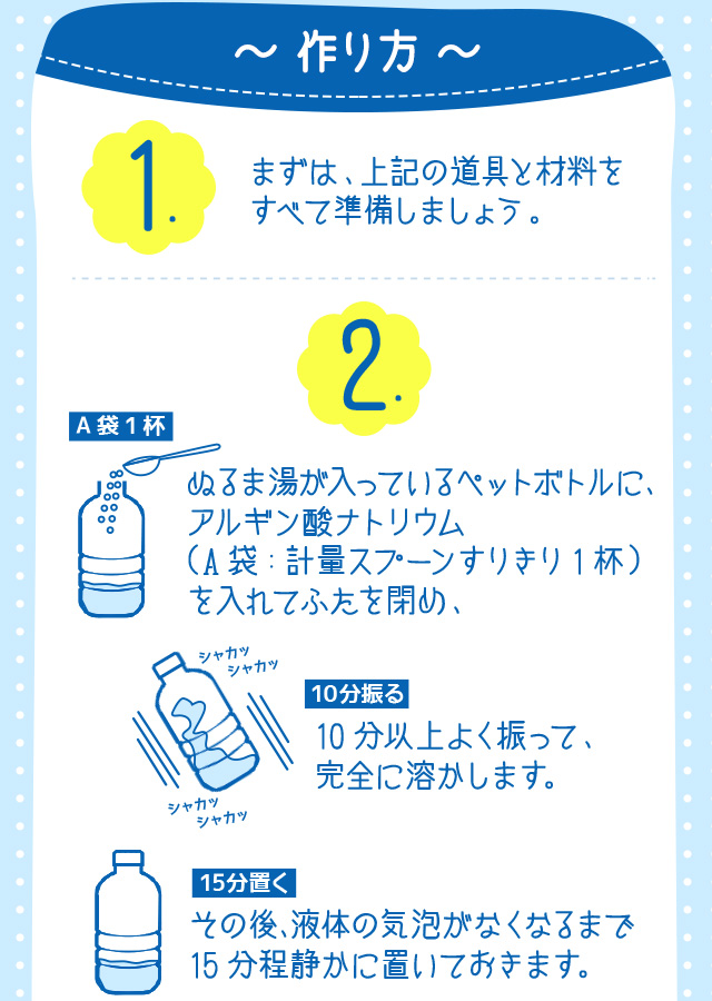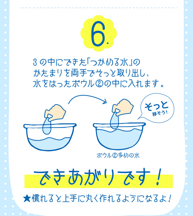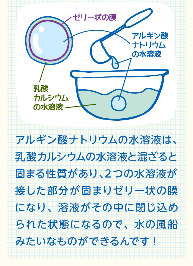 ※「アルギン酸ナトリウム」と「乳酸カルシウム」は食品ですので、作った"つかめる水"は食べても安心です。